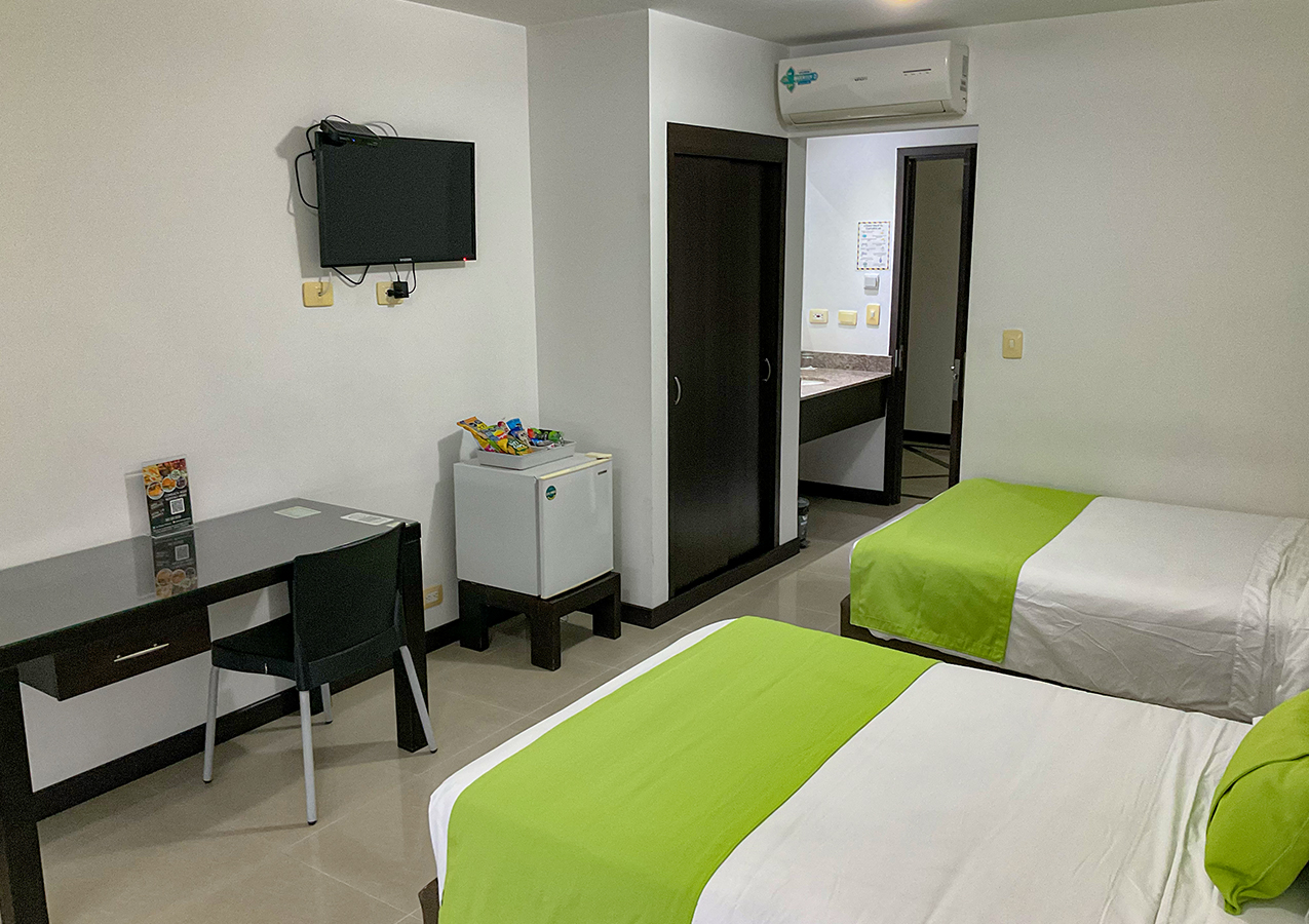 Las habitaciones Twin del Hotel Pinares Plaza son espacios de descanso e inspiración. Cuentan con 2 camas semidobles. Amplios ventanales para disfrutar del paisaje y el aire natural si así lo desea, cortinas blackout, aire acondicionado, escritorio, cajilla de seguridad, televisor LCD, teléfono, minibar y baño con agua caliente. Sujeta a disponibilidad. Sujeta a disponibilidad.